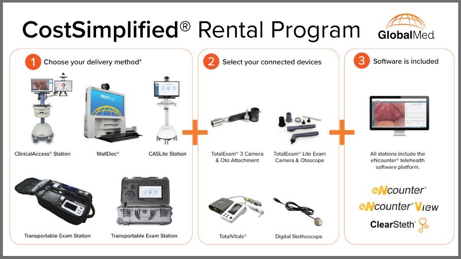 The CostSimplified® rental program includes a telehealth station, a choice of medical devices, and the eNcounter® software platform.